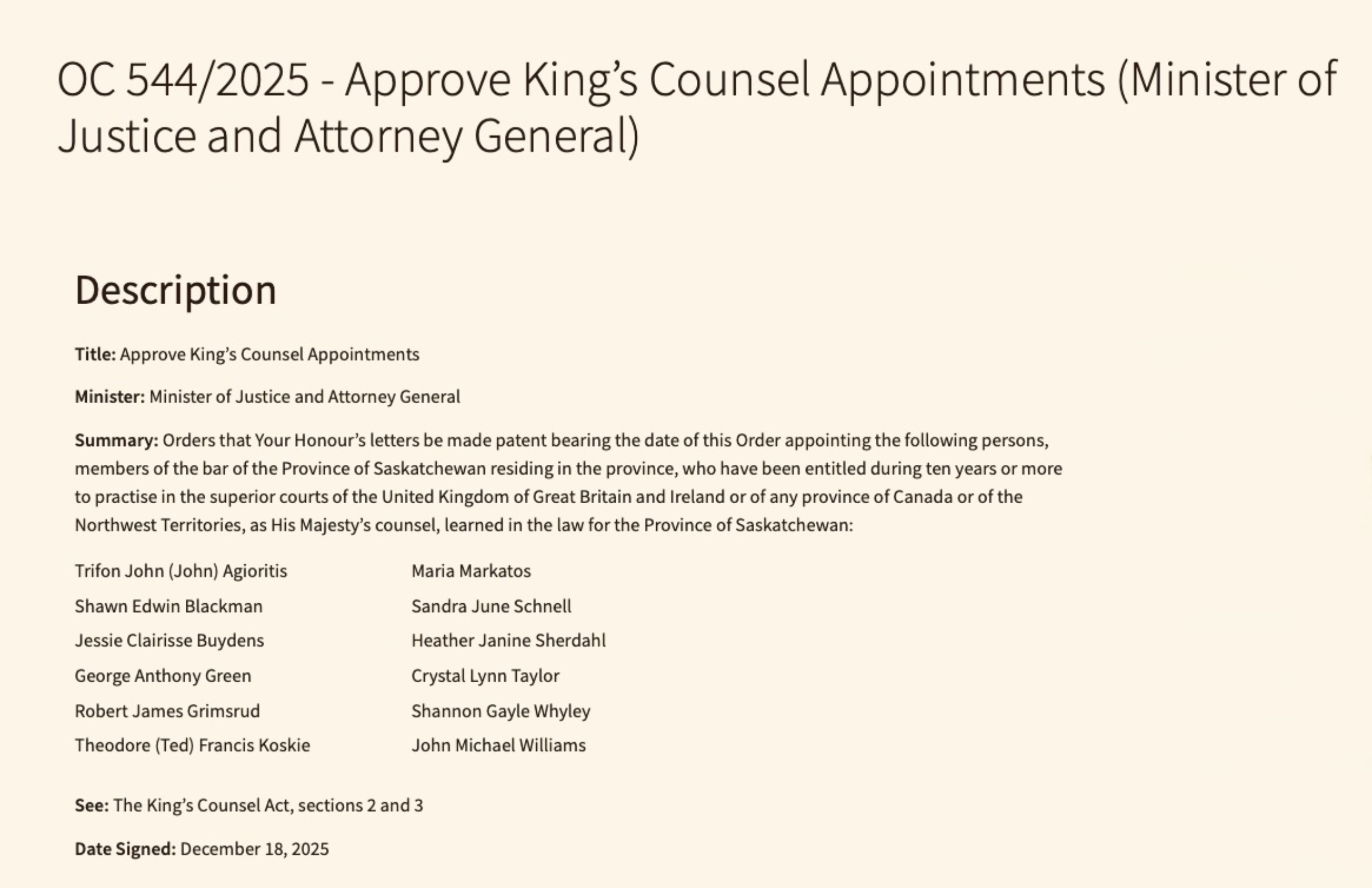 I am also very pleased to extend my sincere congratulations to the other lawyers designated as King’s Counsel in 2025. This year’s appointees represent a wide range of practice areas, roles, and public service — from private practice and legal aid, to Crown service, legislative work, and labour and employment law. Collectively, they reflect the depth, professionalism, and commitment that characterize Saskatchewan’s legal community. I congratulate each of them warmly. Their careers and contributions are well deserving of recognition.